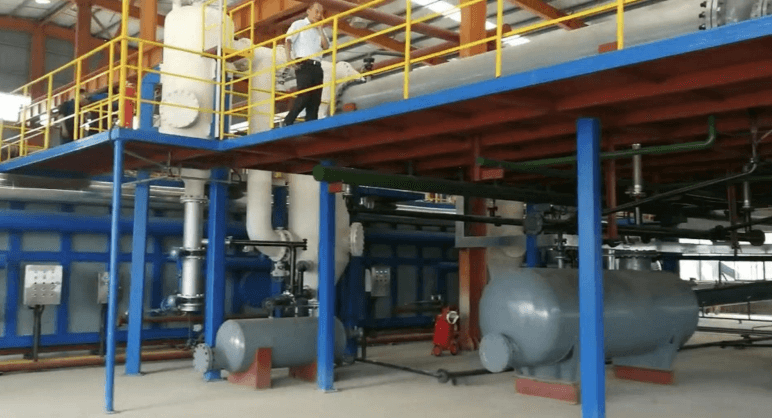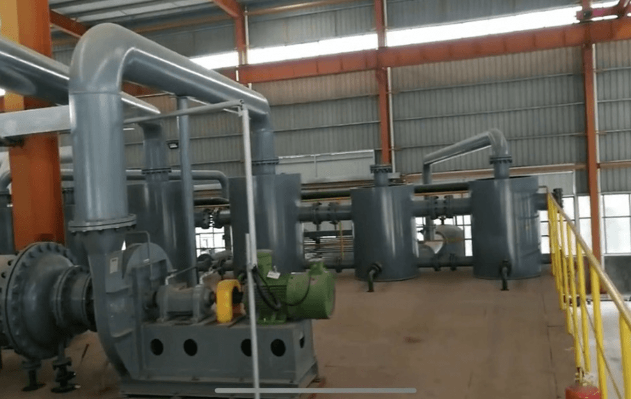 Our total system (single group of 10,000 tons/year, total of 5 groups) is capable of handling 150 tons of waste tires per day, producing 60 tons of fuel oil, 52.5 tons of carbon black, 22.5 tons of steel braid, and 15 tons of hydrocarbon gases